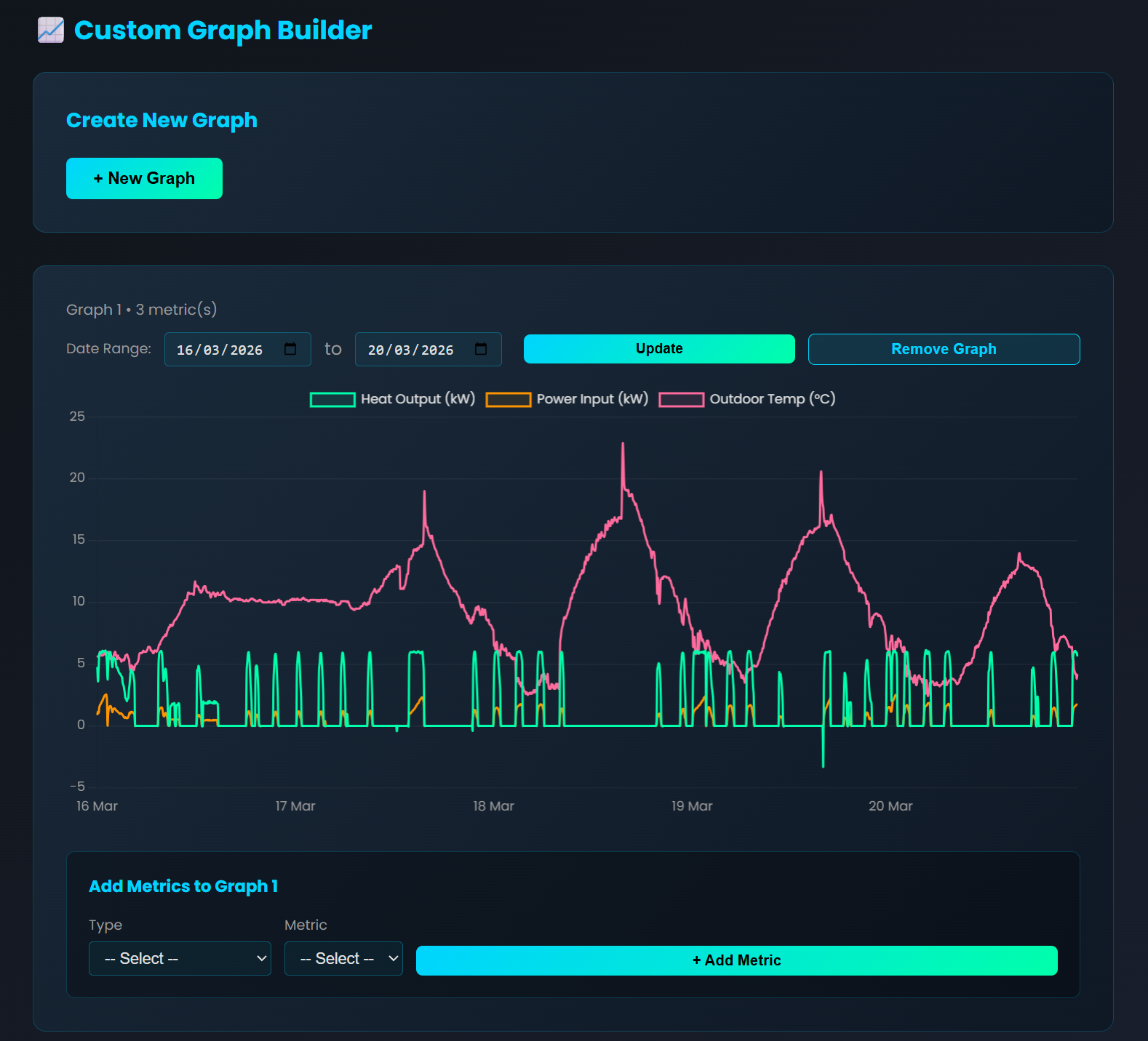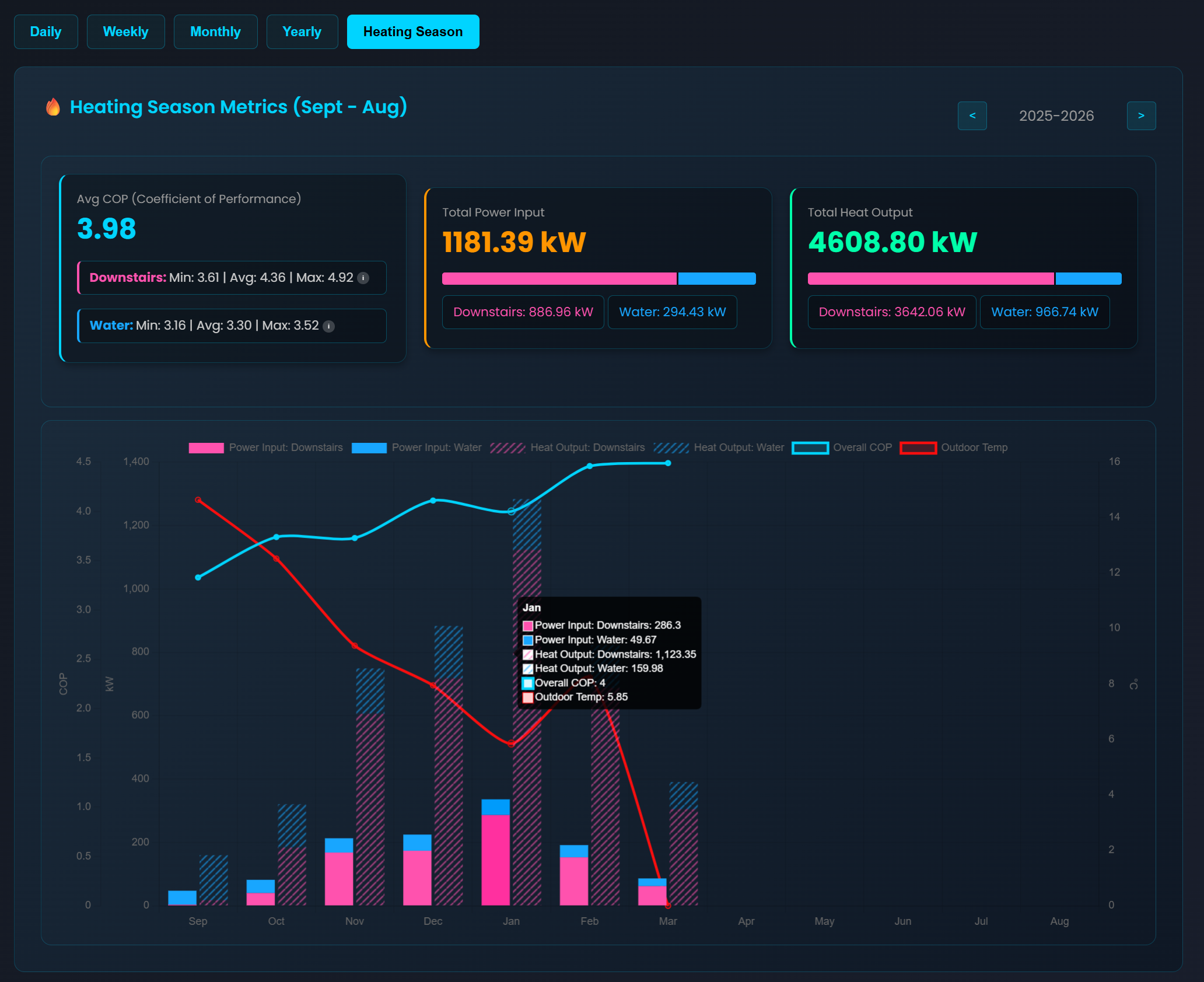 Every Display includes access to the Metrics Dashboard in your home browser. Track performance trends, detect defrost behavior, monitor heating and hot water temperatures, and review usage patterns from iPad, laptop, or desktop.